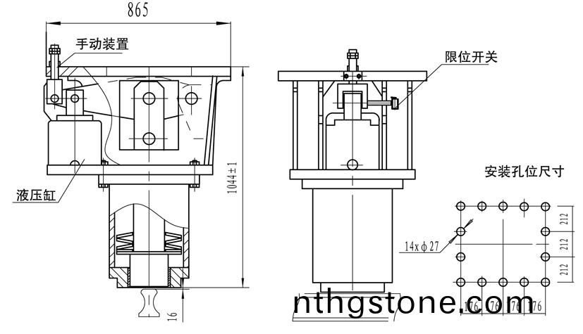 主要(yao)設計(ji)特點(dian): 常閉(bi)式設計、採用(yong)液壓站集(ji)中(zhong)驅(qu)動(dong)控(kong)製以(yi)特製碟形(xing)彈(dan)簧(huang)實(shi)現頂軌製動(dong); 摩擦(ca)塊(kuai)採(cai)用(yong)先進的(de)高耐(nai)磨鋼,性能(neng)可靠(kao); 設有(you)限(xian)位開關(guan),顯示工(gong)作(zuo)狀(zhuang)態(tai); 帶手動釋(shi)放,安(an)裝(zhuang)維護(hu)方(fang)便。